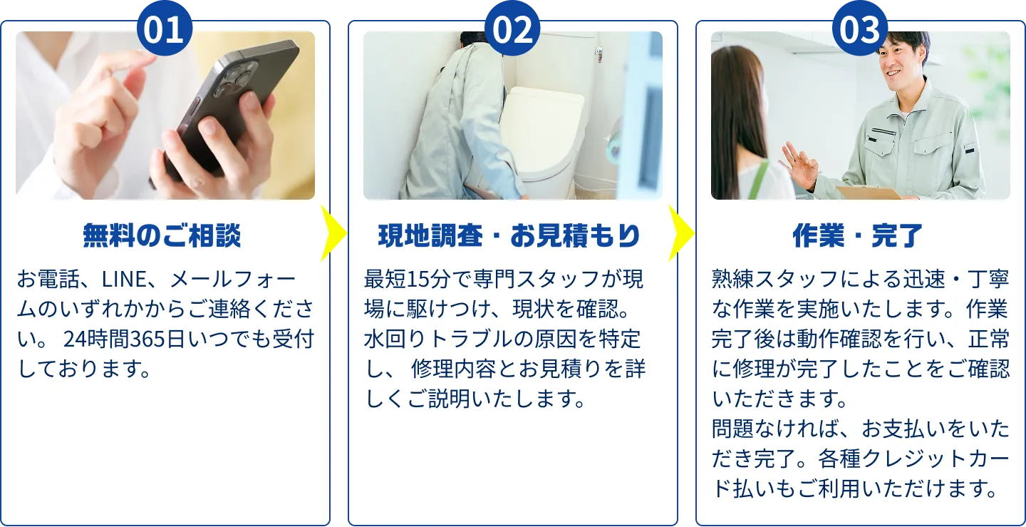 - 症状やトラブルの内容にもよりますが、作業時間の目安はおおよそ30分〜1時間ほどです。状況によって前後する場合には、事前に所要時間の目安をきちんとお伝えいたします。