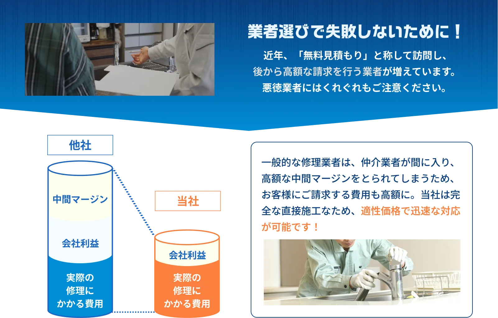 - はい、お電話で状況を伺ったうえで、おおまかな費用の目安をお知らせいたします。ただし、正確な金額については現地での確認後にお見積りをご提示させていただきます。