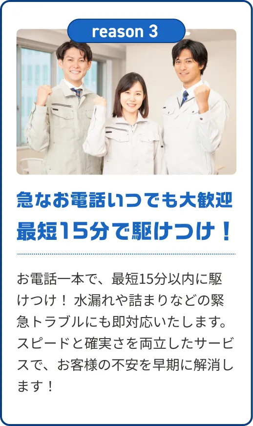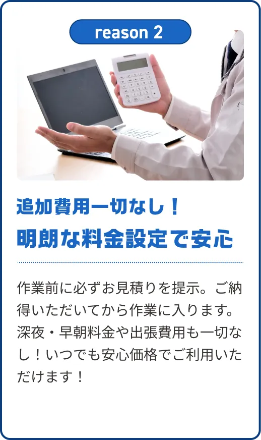 - もちろん、年中無休で24時間いつでもご依頼いただけます。深夜や早朝でも追加料金はかかりませんので、どうぞ安心してお問い合わせください。