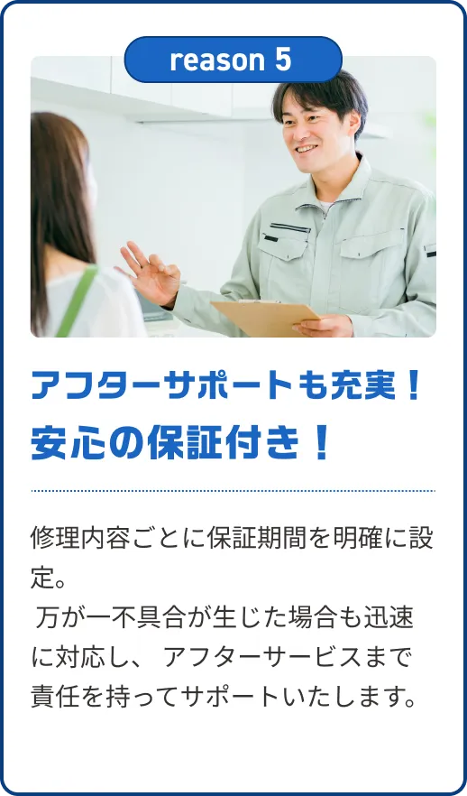 - はい、作業内容に応じた保証制度をご用意しております。通常の修理には6ヶ月間、部品交換を含む修理には1年間の保証が付きますので、安心してお任せください。