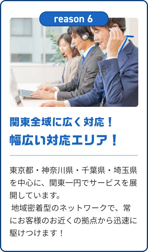 - 対応エリア内であれば、出張費は一切いただいておりません。エリア外への訪問については、別途料金が発生する可能性がありますので、その際は事前にご案内いたします。