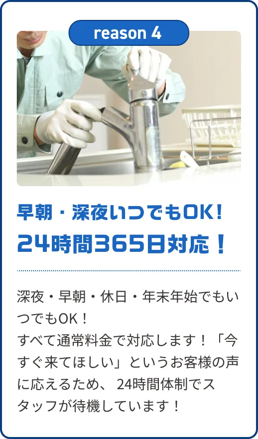 - もちろん、年中無休で24時間いつでもご依頼いただけます。深夜や早朝でも追加料金はかかりませんので、どうぞ安心してお問い合わせください。